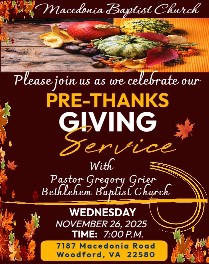 ![]() Please join us on Sunday, November 9th, during our morning worship service, as we honor and pay tribute to all veterans who served in the U.S. Armed Forces. We encourage you to invite family and friends to fellowship with us. Macedonia Church Family and Friends, please join us for our "Pre-Thanksgiving" Service. Pastor Gregory Grier, Bethlehem Baptist Church will be our Guest Speaker. We encourage you to invite others to fellowship with us! ![]() "Rejoice always, pray continually, give thanks in all circumstances, for this is God's will for you in Christ Jesus." (1 Thessalonians 5:16-18). Advent Season begins - preparing us for the coming of Jesus Christ. This day is also Casual Sunday. Church Service will begin at 10:00 A.M. Each Sunday we will spotlight a word of reflection. Please invite others to join us as we embrace the Advent Season. "The people who walked in darkness will see a great light. For those who live in a land of deep darkness, a light will shine. (Isaiah 9:2) This light represents "HOPE!" |