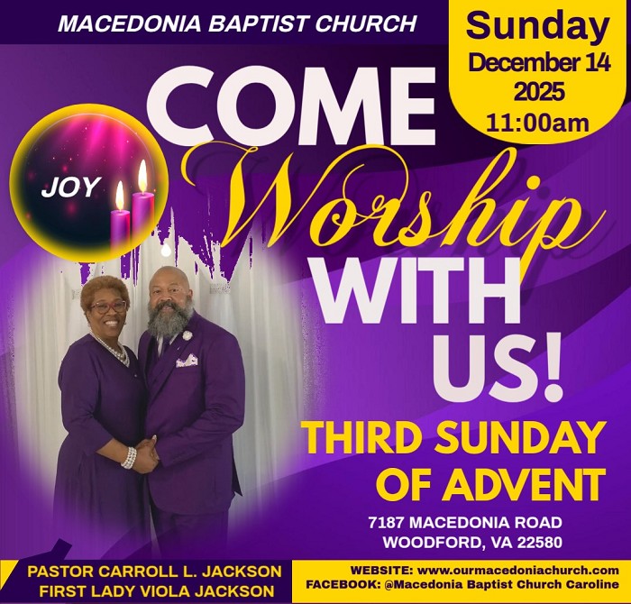![]() Advent Season began on Sunday, November 30, 2025, with the lighting of the first purple candle, representing "Hope" and preparing and reminding us of the journey of Mary and Joseph to Bethlehem, in anticipation of the birth of Jesus Christ. The lighting of the second purple candle was lit on Sunday, December 7, 2025, representing "Peace." Advent Season ends on Christmas Eve, Wednesday, December 24, 2025. We encourage you to invite others to come out and fellowship with us as we embrace the Advent Season. ![]() "Shout aloud and sing for Joy, people of Zion, for great is the Holy One of Israel among you. (Isaiah 12:6) |