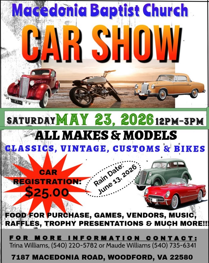 ![]() CHURCH FAMILY AND FRIENDS!! PLEASE GET READY FOR OUR UPCOMING DONNELL E. CALLIS SCHOLARSHIP FASHION SHOW! Join us for an "AFTERNOON OF FASHION" for our 3rd Annual Donnell E. Callis Scholarship Fashion Show, hosted by the Scholarship Committee! A high school student (senior) at Macedonia who plans to further their education, will be presented with a scholarship. If you have already signed up to be a model, "we thank you" and ask that you please provide Sis. Bernadette Rollins, with your clothing (category) description card, as soon as possible. The modeling categories are: Church Attire (with hats), Business, Formal, Ethnic, Casual/Sports Wear and Urban Wear. You may also bring category cards with you to rehearsal. The next rehearsal will be held on Saturday, April 18th @ 10:00am. Donations are also being requested for the Silent Auction table. Donated items can range from: gift cards, themed baskets, movie tickets, travel packages, event tickets, custom artwork to outdoor sports tickets. Please invite extended family and friends to come out and join us for an afternoon of fellowship and fashion!! "For I know the plans I have for you," declares the LORD, "plans to prosper you and not to harm you, plans to give you hope and a future." (Jeremiah 29:11) Please join us for our Pastor's Aide Annual Day. We're looking forward to having you worship with us! ![]() PLEASE SAVE THE DATE!! Please come out and join the Communications Ministry on their 2nd Car Show. All makes, models and years are welcome. Car Registration Donation is: $25/per car. Vendor spots are available. (Table Donation: $10/per table) There will be food for purchase, games, raffles, music, Trophy Presentations and so much more! ![]() |