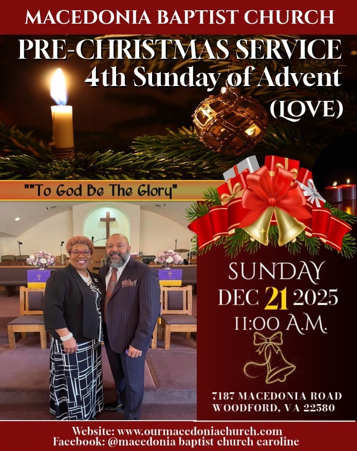 ![]() ![]() Advent Season began on Sunday, November 30, 2025, with the lighting of the first purple candle, representing "Hope" and preparing and reminding us of the journey of Mary and Joseph to Bethlehem, in anticipation of the birth of Jesus Christ. The lighting of the second purple candle was lit on Sunday, December 7, 2025, representing "Peace." Today, December 14, 2025, is Third Sunday of Advent, representing "Joy." Advent Season ends on Christmas Eve, Wednesday, December 24, 2025. We encourage you to invite others to come out and fellowship with us on Sunday, December 21, 2025, 11:00 A.M., as we continue to embrace the Advent Season. "Shout aloud and sing for Joy, people of Zion, for great is the Holy One of Israel among you. (Isaiah 12:6) |